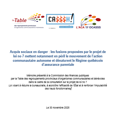 Le 30 novembre 2025, la Table a déposé son mémoire intitulé Acquis sociaux en danger : les fusions proposées par le projet de loi no 7 mettent notamment en péril le mouvement de l’action communautaire[...]