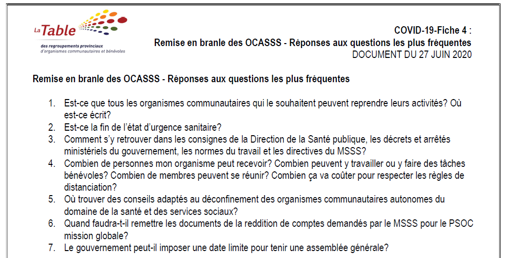 COVID-19-Fiche 4 : Remise en branle des OCASSS – Réponses aux questions les plus fréquentes