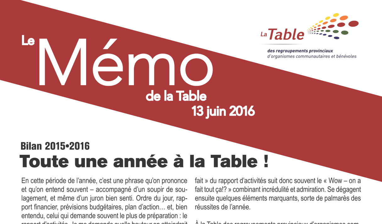 Mémo de la Table des regroupements provinciaux d’organismes communautaires et bénévoles – MEMO du 13 juin 2016
