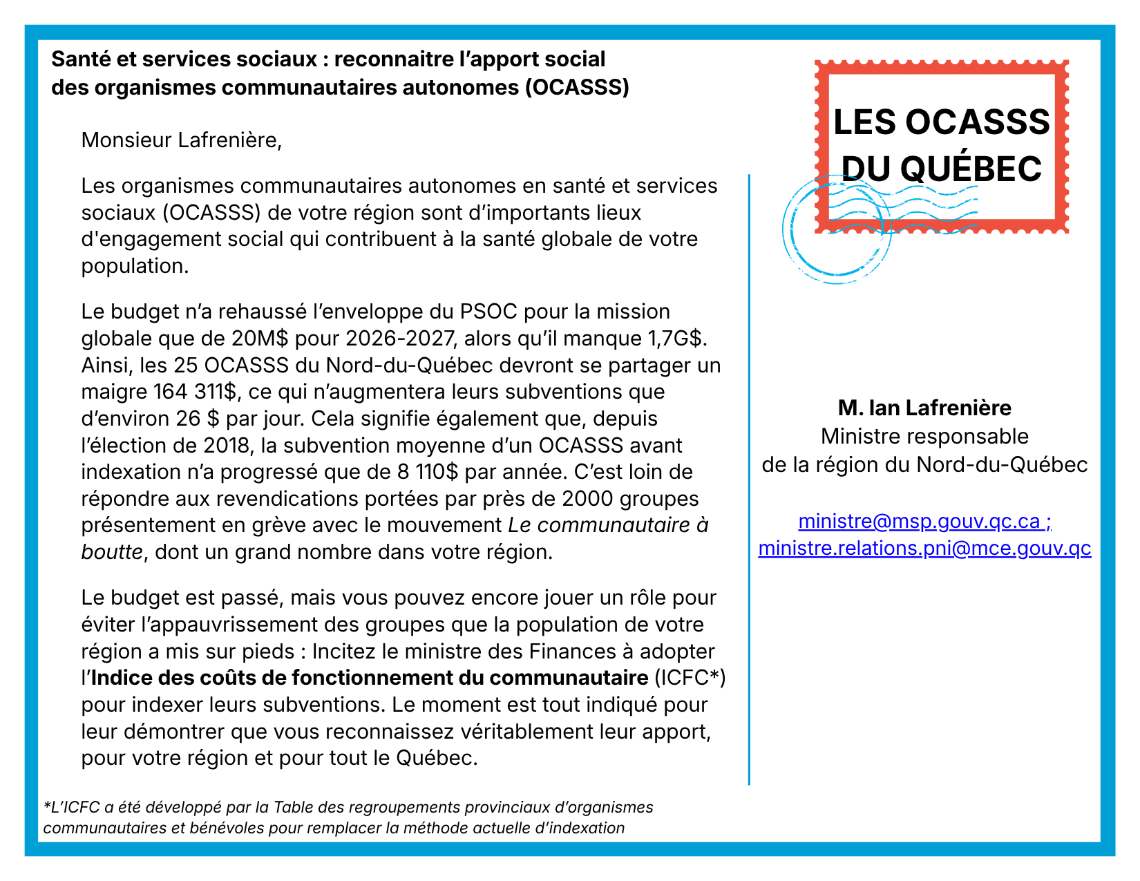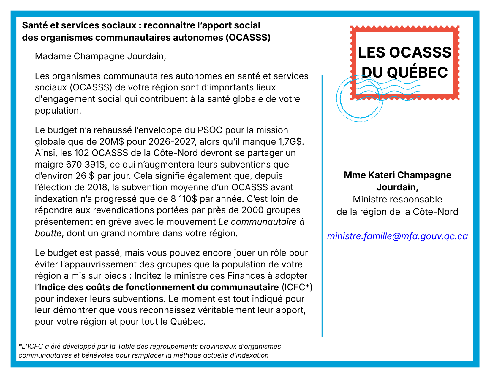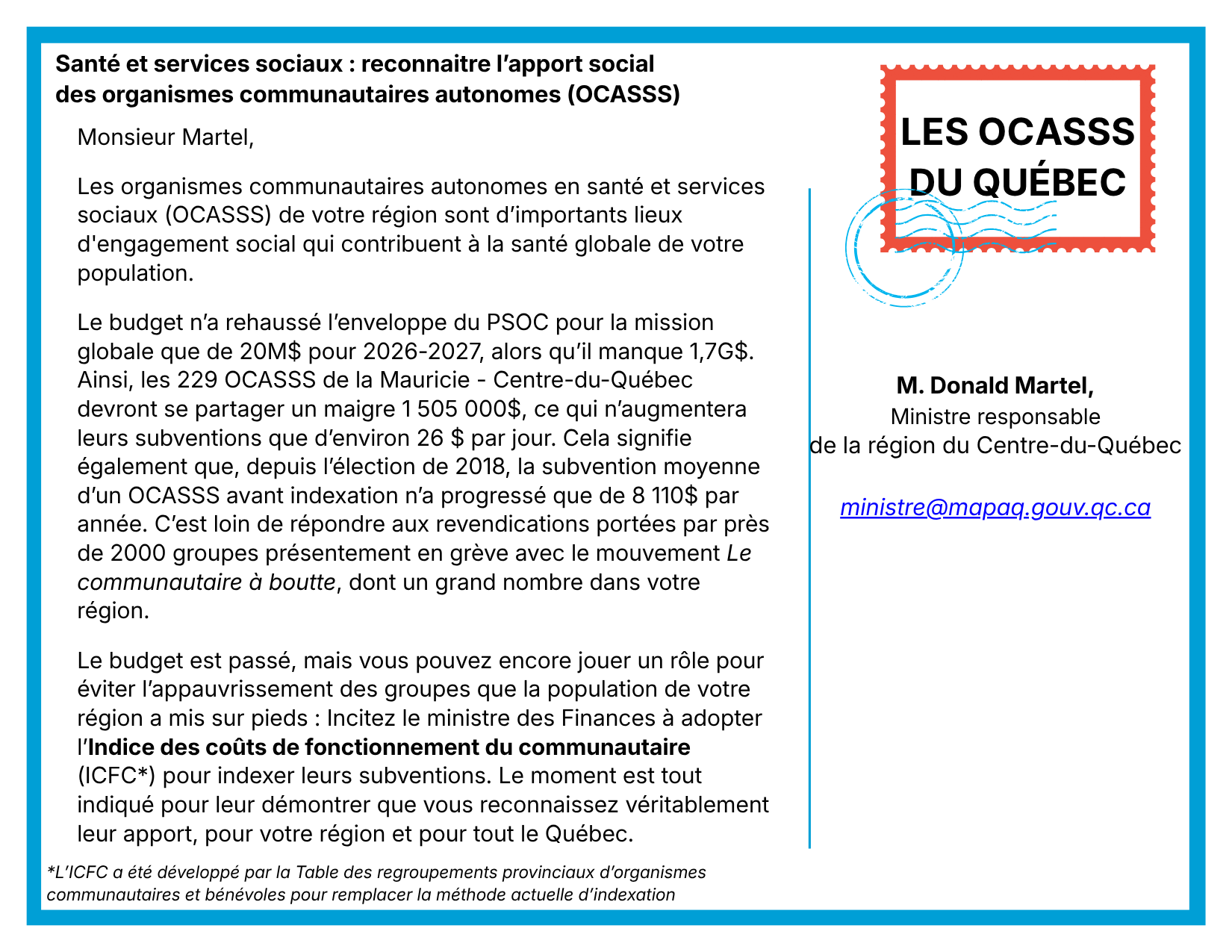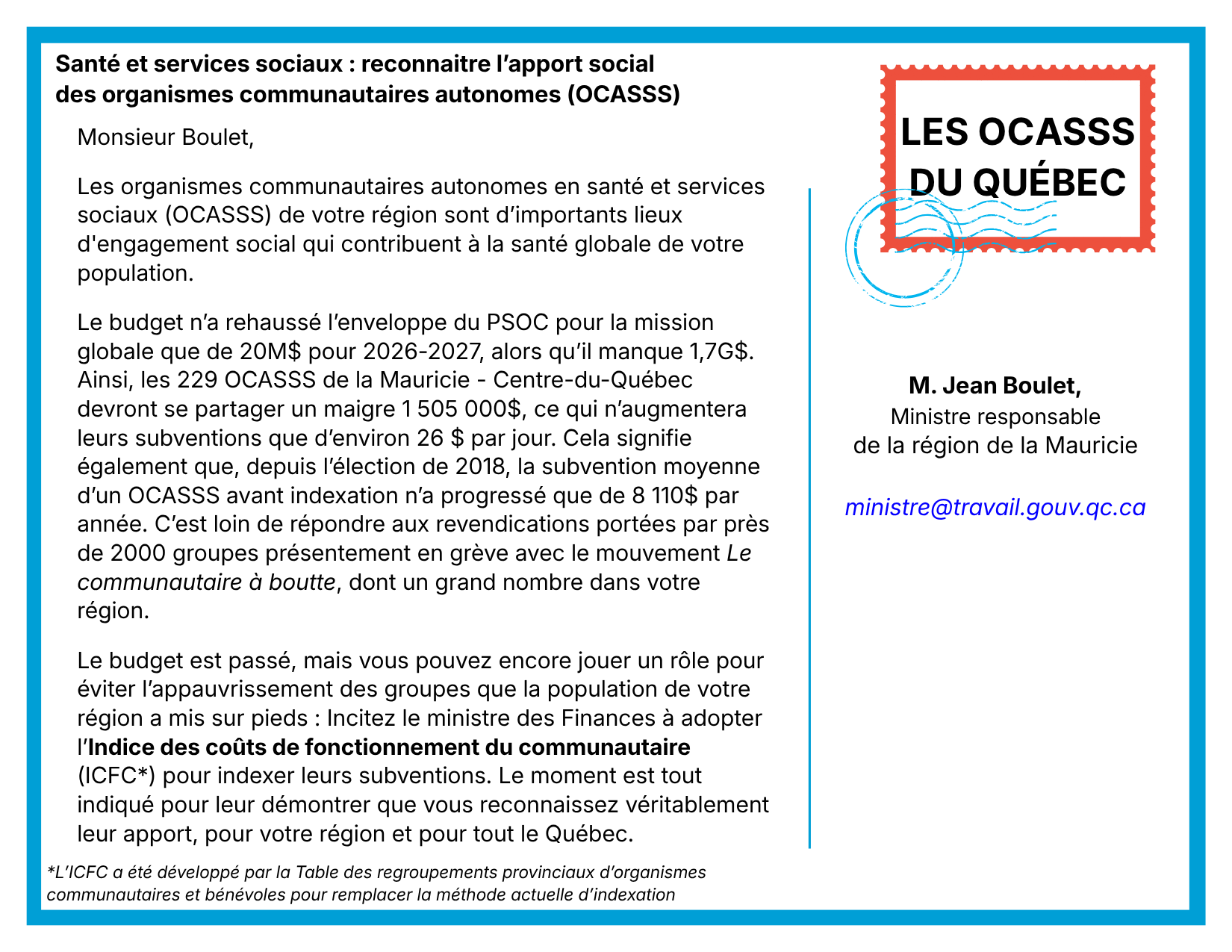 Le budget n’a rehaussé l’enveloppe du PSOC pour la mission globale que de 20M$ pour 2026-2027, alors qu’il manque 1,7G$. Ainsi, les [nombre d’OCASSS] de votre région devront se partager un maigre [montant de rehaussement pour la région], ce qui n’augmentera leurs subventions que d’environ 26$ par jour. Cela signifie également que, depuis l’élection de 2018, la subvention moyenne d’un OCASSS avant indexation n’a progressé que de 8 110$ par année. C’est loin de répondre aux revendications portées par près de 2000 groupes présentement en grève avec le mouvement Le communautaire à boutte, dont un grand nombre dans votre région.