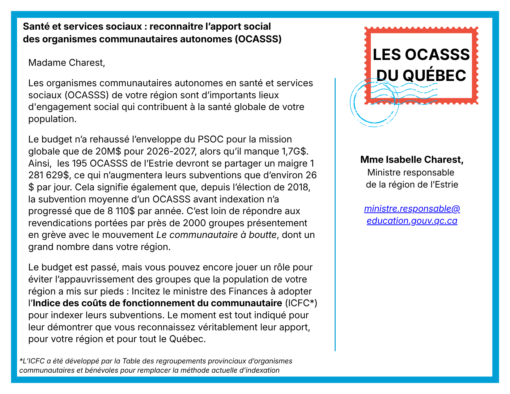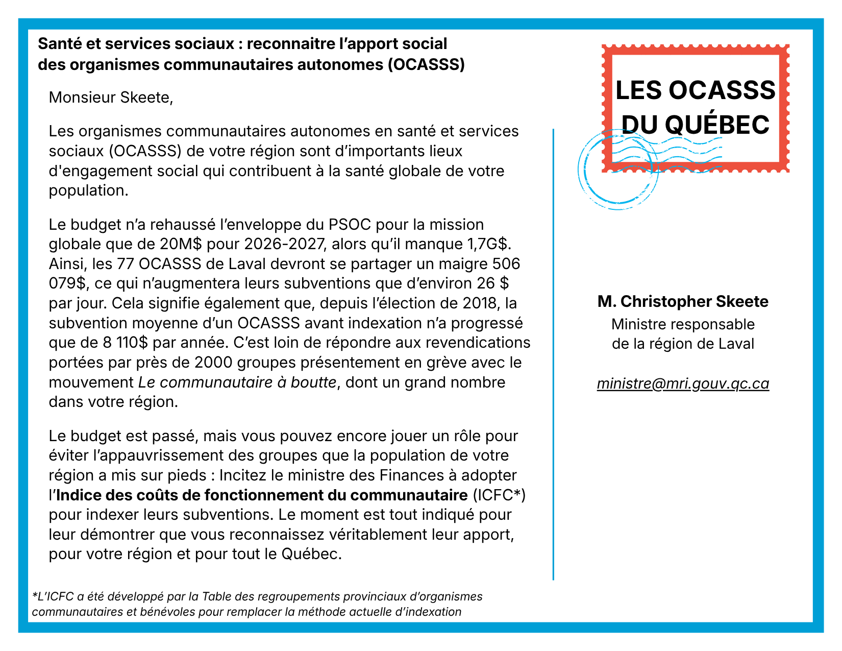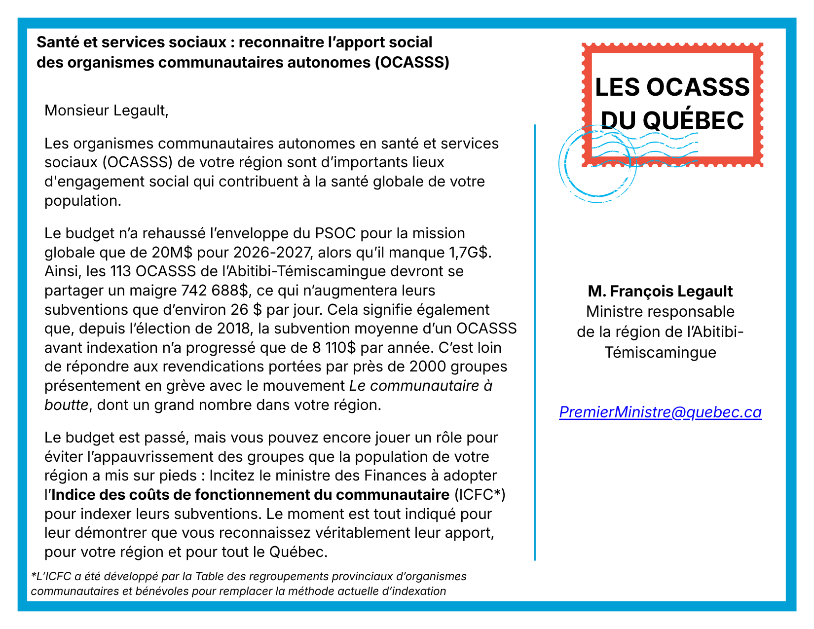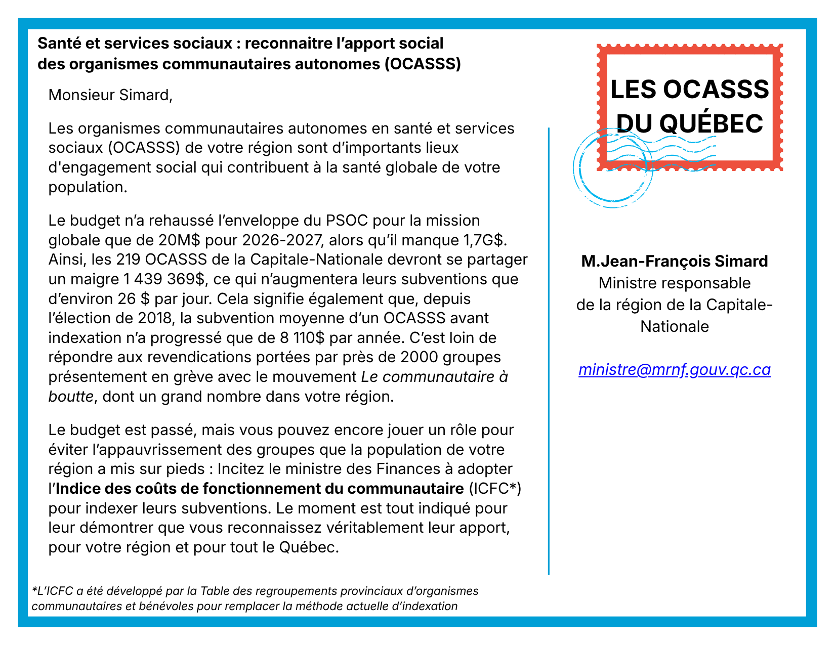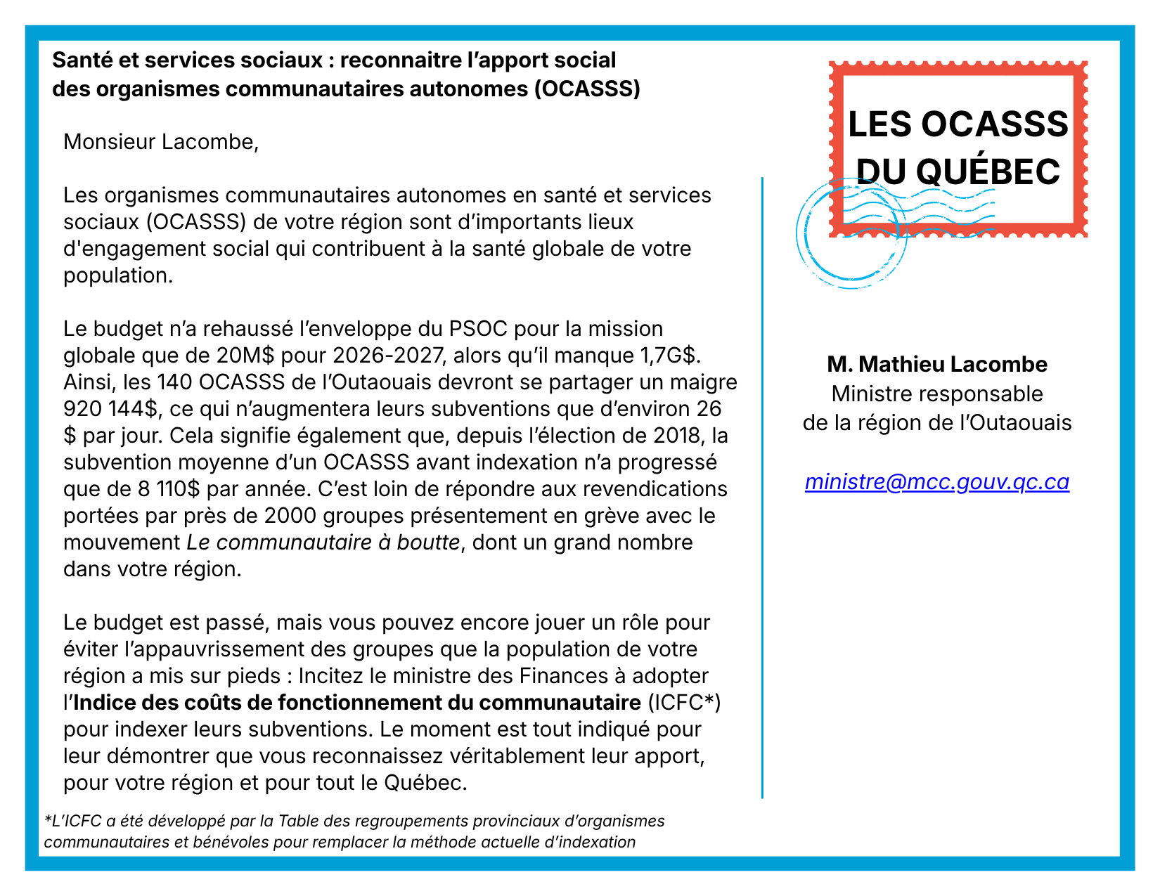 Le budget n’a rehaussé l’enveloppe du PSOC pour la mission globale que de 20M$ pour 2026-2027, alors qu’il manque 1,7G$. Ainsi, les [nombre d’OCASSS] de votre région devront se partager un maigre [montant de rehaussement pour la région], ce qui n’augmentera leurs subventions que d’environ 26$ par jour. Cela signifie également que, depuis l’élection de 2018, la subvention moyenne d’un OCASSS avant indexation n’a progressé que de 8 110$ par année. C’est loin de répondre aux revendications portées par près de 2000 groupes présentement en grève avec le mouvement Le communautaire à boutte, dont un grand nombre dans votre région.